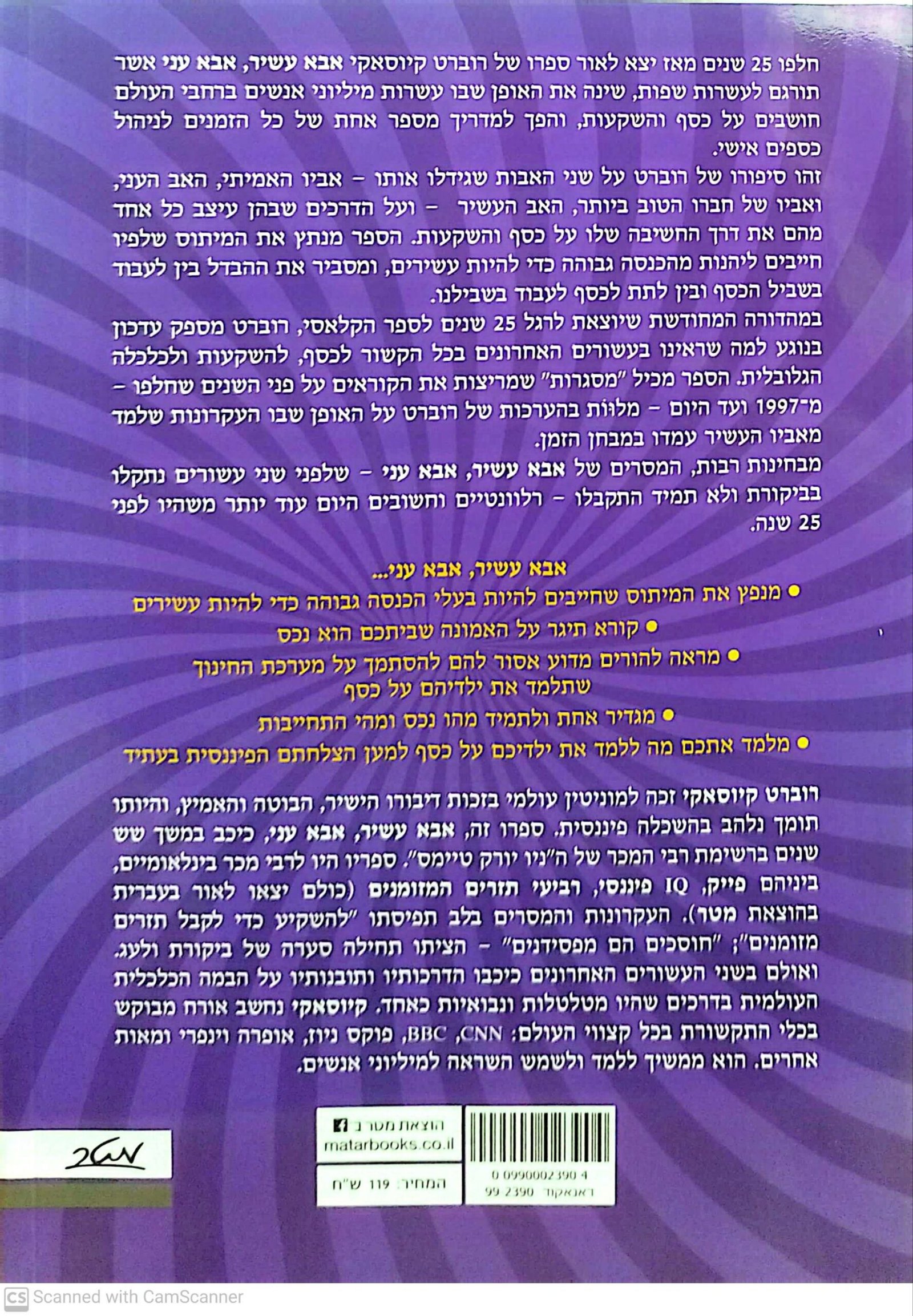 הספר "אבא עשיר אבא עני" מאת רוברט ט. קיוסאקי מציג מבט רענן על חינוך פיננסי, תוך שהוא משווה בין שני מודלים של חשיבה כלכלית – זה של אביו הביולוגי וזה של אביו הרוחני. באמצעות סיפורים אישיים ותובנות נגישות, הספר שובר מיתוסים רווחים על כסף, השקעות, עבודה וביטחון כלכלי, ומעודד את הקוראים לקחת אחריות על עתידם הפיננסי. זהו ספר עיון אישי שמשלב כלים מעשיים עם מסרים מעוררי השראה בנושא יזמות, עצמאות כלכלית וחשיבה אחרת על קריירה והשקעות.