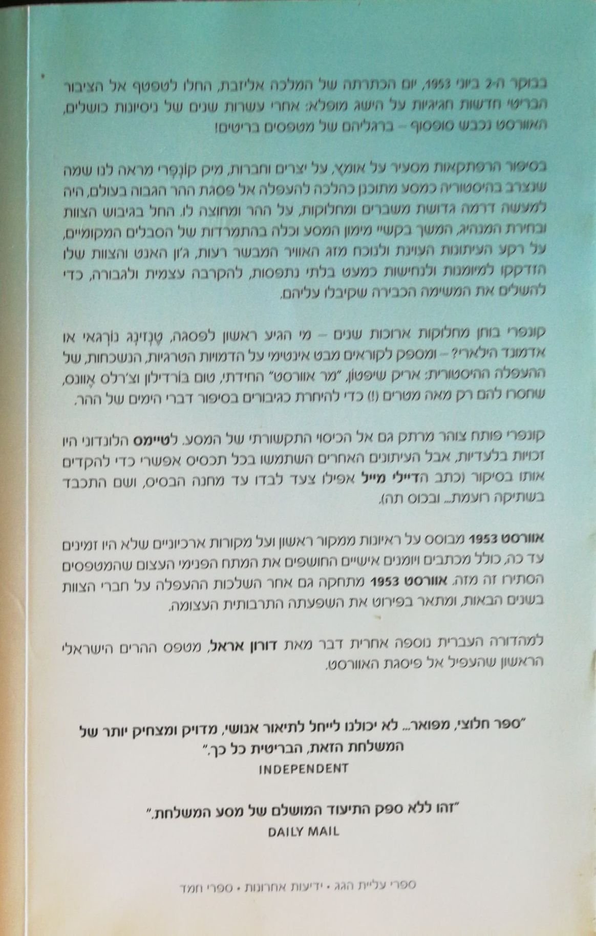 הספר "אוורסט 1953" מאת מיק קונפרי מתעד את סיפור ההעפלה הראשון לפסגת האוורסט על ידי המשלחת הבריטית בראשות ג'ון האנט, ובה השתתפו גם סר אדמונד הילרי וטנזינג נורגיי. קונפרי משחזר בפרטים חיים את ההכנות, האתגרים הפיזיים והנפשיים, והמאבק הקיצוני מול תנאי מזג האוויר, לצד היריבויות, השותפות והגבורה האנושית שאפיינו את המסע. הספר מבוסס על יומנים, מכתבים ועדויות שנחשפו לראשונה, ומעניק מבט מעמיק על הרגע ההיסטורי שבו כבש האדם לראשונה את הפסגה הגבוהה בעולם.