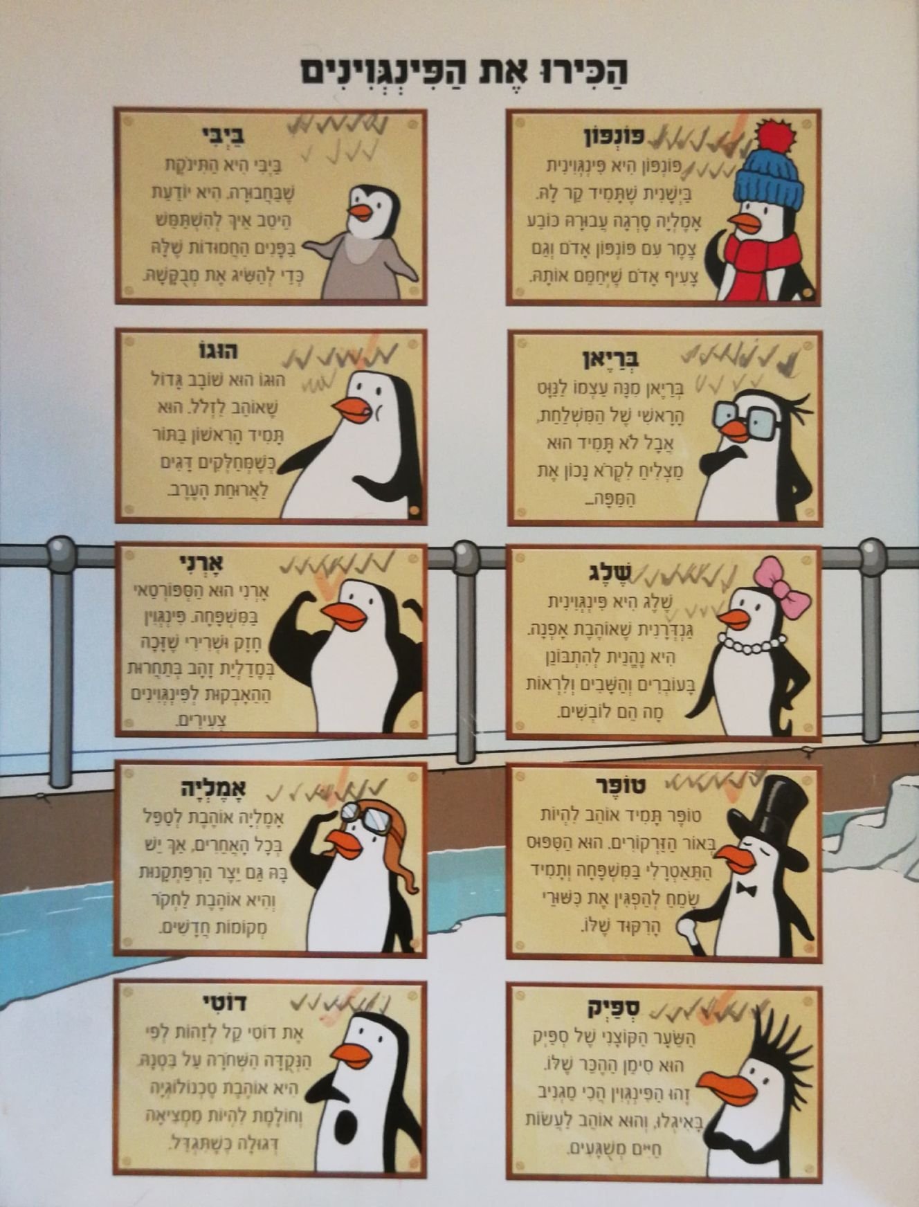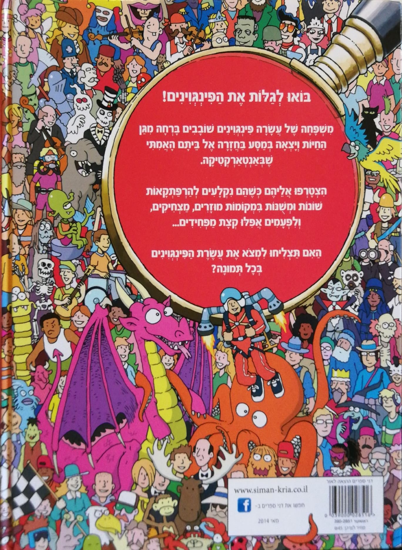 ספר חיפוש צבעוני ומהנה המציע פעילות משותפת לילדים ולהורים. בכל עמוד מסתתרים עשרה פינגווינים שובבים שיצאו לטייל ברחבי העולם – מהעיר הסואנת ועד לקרקס, מג'ונגל פראי ועד למוזיאון – והמשימה היא לאתר אותם בין שלל הדמויות והפרטים. הספר מפתח יכולת הבחנה, ריכוז וחדות עין, ומזמין את הקוראים לצלול לתוך איורים עשירים בפרטים, הומור ודמיון. מתאים לילדים סקרנים ולכל מי שאוהב אתגרי חיפוש ברוח “איפה אפי?”.