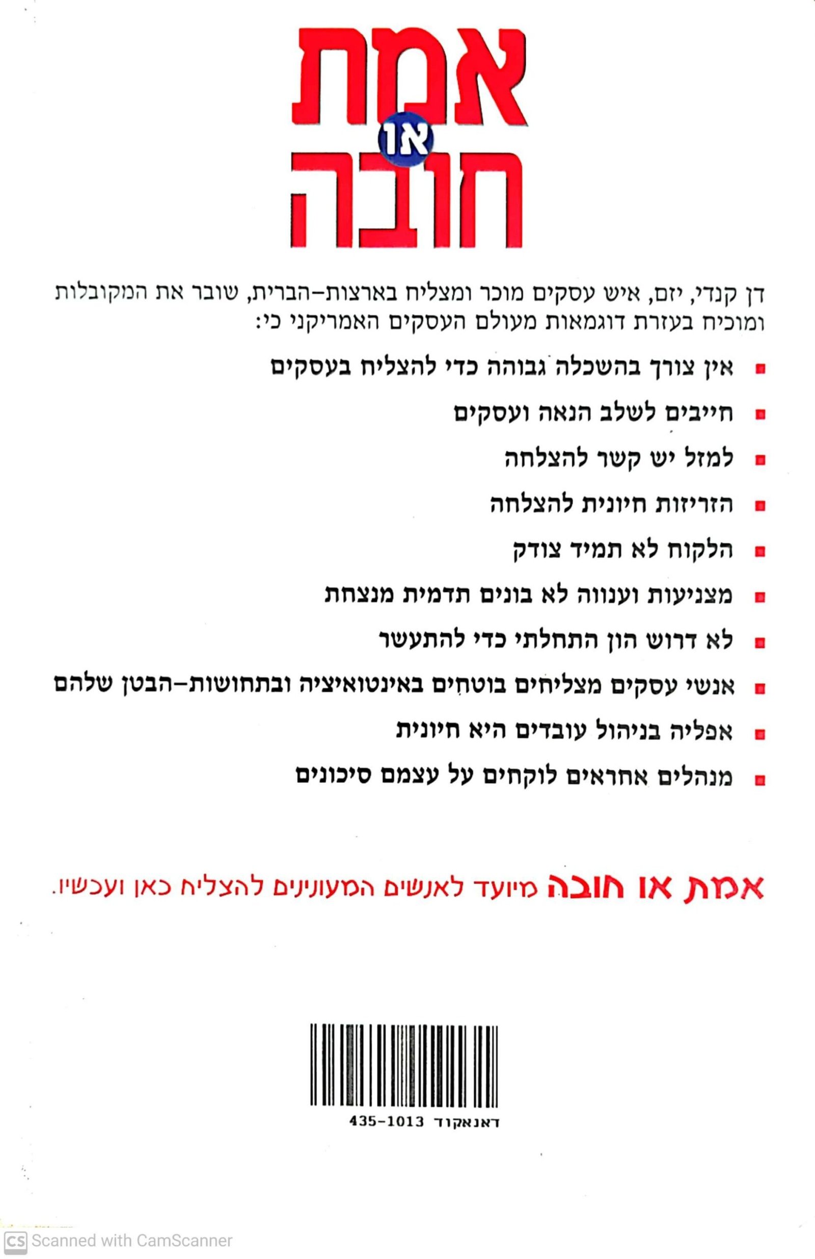 אמת או חובה: אסטרטגיית ההצלחה העסקית של הפוך על הפוך מאת דן קנדי הוא ספר עיון מרתק על עולם השיווק, הניהול והחשיבה האסטרטגית. קנדי, אחד מהיועצים העסקיים הבולטים בארצות הברית, מציג גישה נועזת ובלתי שגרתית להצלחה — כיצד לשבור את הכללים המקובלים, לאתגר מוסכמות ולבנות אסטרטגיות מקוריות שמביאות תוצאות ממשיות. דרך דוגמאות מעולם העסקים והיזמות, הספר מציע כלים מעשיים לחשיבה יצירתית, קידום עצמי ושיווק חכם בעידן תחרותי.