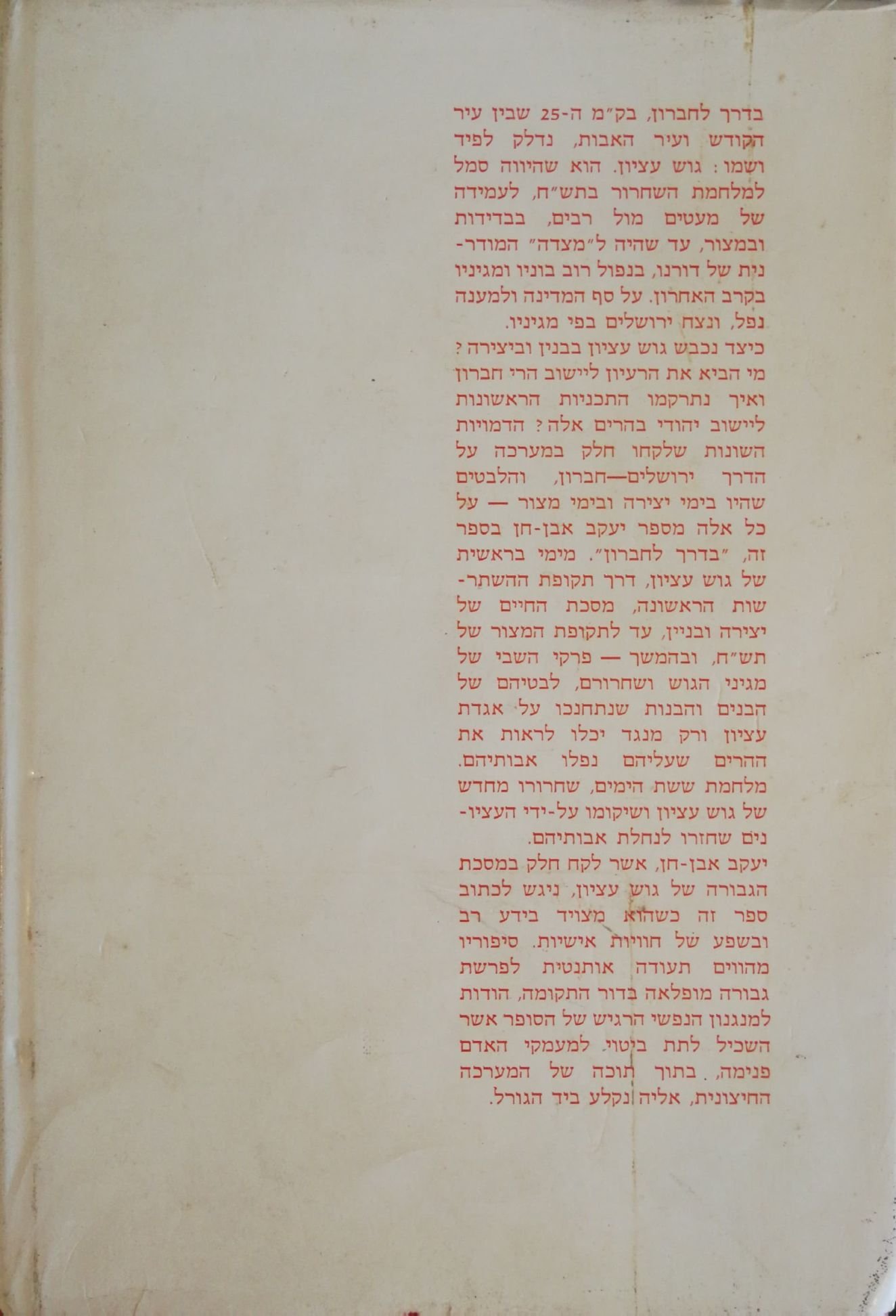 בדרך לחברון מאת יעקב אבן־חן הוא ספר עיון היסטורי מקיף המתאר את תולדות היישוב היהודי בגוש עציון ואת מאבקיו מראשית ההתיישבות ועד לאחר מלחמת ששת הימים. הספר מביא עדויות ממקור ראשון, תיעוד של קרבות, מכתבים ויומנים אישיים, לצד סקירה מעמיקה של הרקע הלאומי והאידיאולוגי שהוביל להקמת היישובים באזור. דרך סיפורם של הלוחמים, החלוצים והמשפחות שחיו במקום, נחשפת דמותה של חברה נחושה ואמיצה, ששילמה מחיר כבד על נאמנותה לאדמתה ולחזונה.