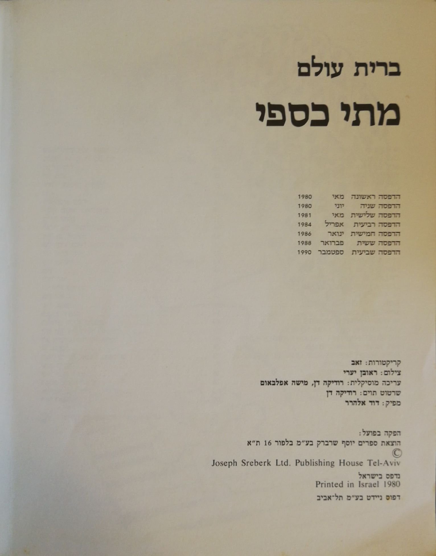 ברית עולם מאת מתי כספי הוא ספר תווים מרהיב המאגד מבחר משיריו האהובים של אחד המוזיקאים הבולטים בישראל. הספר כולל מילות שירים, תווים ואקורדים לגיטרה, לצד ציורים ותרשימים המלווים את היצירה המוזיקלית. זהו מסמך תרבותי המאפשר הצצה לעומק העשייה של כספי – מלחין, זמר ומעבד פורץ דרך – ומציג את רוח היצירה הישראלית דרך שפה מוזיקלית ייחודית, עשירה ומלאת רגש.