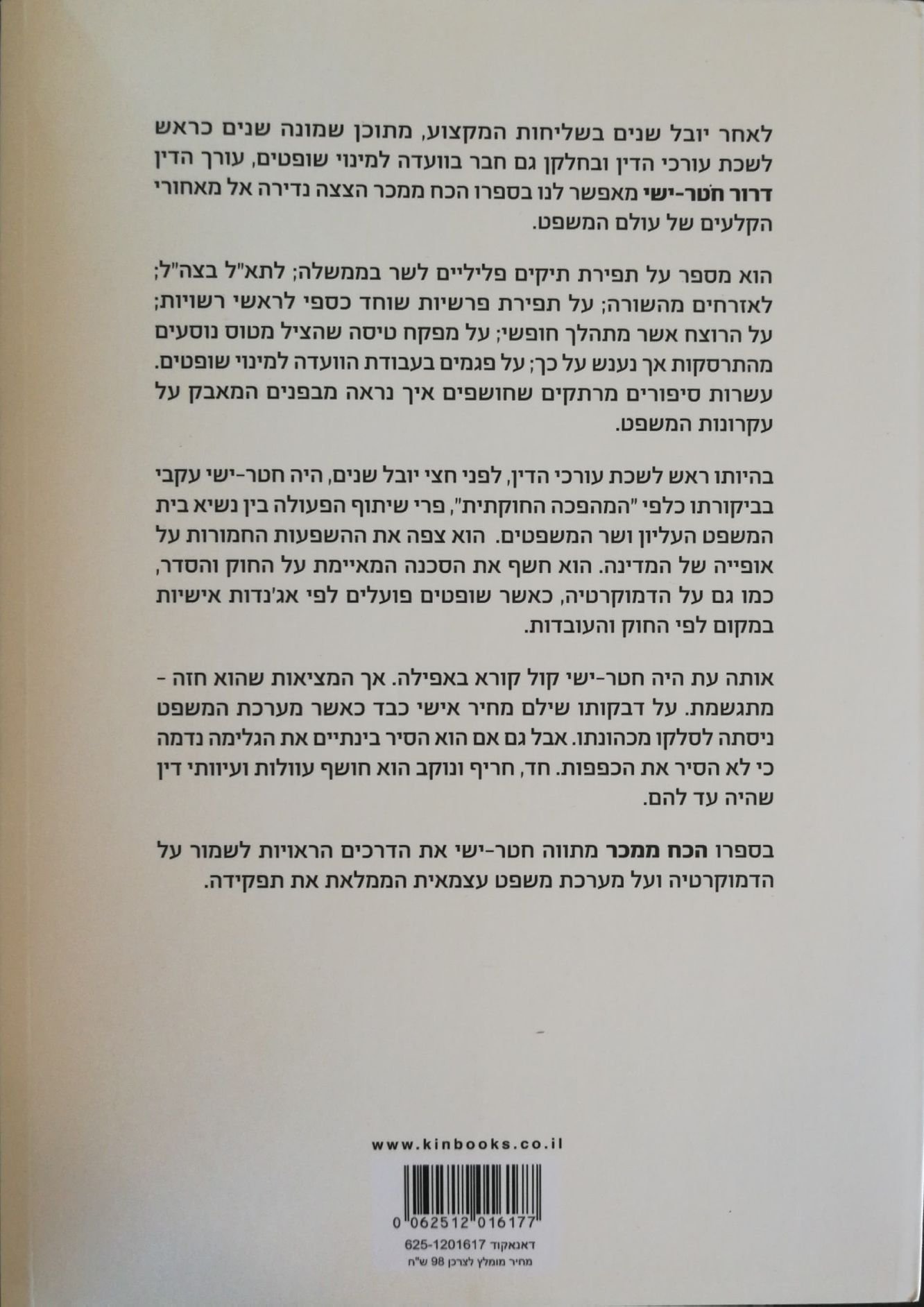 הכח ממכר מאת דרור חטר־ישי הוא ספר עיון נוקב על מערכת המשפט, הפוליטיקה והיחסים שבין שלטון, אחריות ויצר הכוח. מתוך ניסיונו רב־השנים בעולם המשפט, חטר־ישי מתאר את מאחורי הקלעים של המערכת – מהשופטים ועד הפוליטיקאים – וחושף את הדינמיקות, הקשרים והלחצים המעצבים את קבלת ההחלטות בישראל. הספר משלב תיעוד אישי, ניתוח ביקורתי וסיפורים אמיתיים, ומעלה שאלות עקרוניות על צדק, מוסר והשפעתו המשכרת של הכוח על בני אדם.