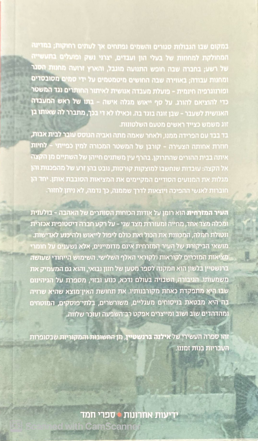 "העיר המזרחית" מאת אילנה ברנשטיין מצייר עולם דיסטופי במציאות ריאליסטית, שבו שתי אחיות מנסות לשרוד תחת משטר טוטליטרי אכזרי. במציאות של מעקב אלקטרוני, מחנות עבודה, השפלה ממוסדת וסמים מנטרלים, נרקם סיפור על מאבק, בגידה, אובדן והתעוררות. גיבורת הסיפור, בתו של מדען בכיר לשעבר, מגלה שבן זוגה אינו אלא שליח של המערכת – והגילוי מזעזע את עולמה. מתוך ההריסות, היא ואחותה יוצאות לדרך של התנגדות שקטה, שמובילה למרד פנימי וחיצוני כאחד. הרומן שוזר דרמה פסיכולוגית עם ביקורת חברתית ופוליטית, בשפה מהודקת ואינטימית.
