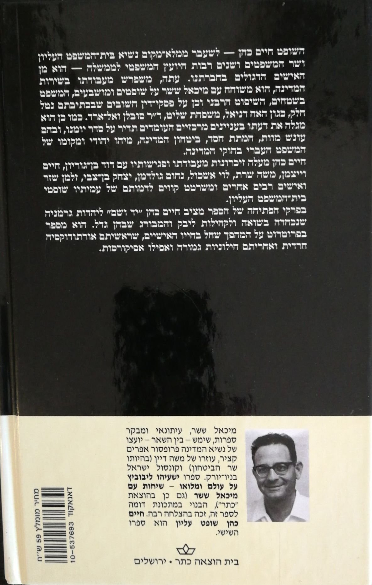 חיים כהן – שופט עליון: שיחות עם מיכאל ששר הוא ספר עיון ביוגרפי מרתק, המבוסס על סדרת שיחות עומק בין השופט חיים כהן לעיתונאי והסופר מיכאל ששר. דרך הדיאלוגים הכנים נפרשת דמותו של אחד המשפטנים הבולטים בתולדות מדינת ישראל – שופט עליון, יועץ משפטי לממשלה והוגה דעות אמיץ – אשר השפיע רבות על עיצוב מערכת המשפט ועל השיח הציבורי סביב צדק, מוסר וזכויות אדם. הספר חושף את השקפותיו, לבטיו ומורשתו של כהן, ומציע הצצה נדירה לעולמו האישי והמקצועי של איש רוח ומשפט יוצא דופן.