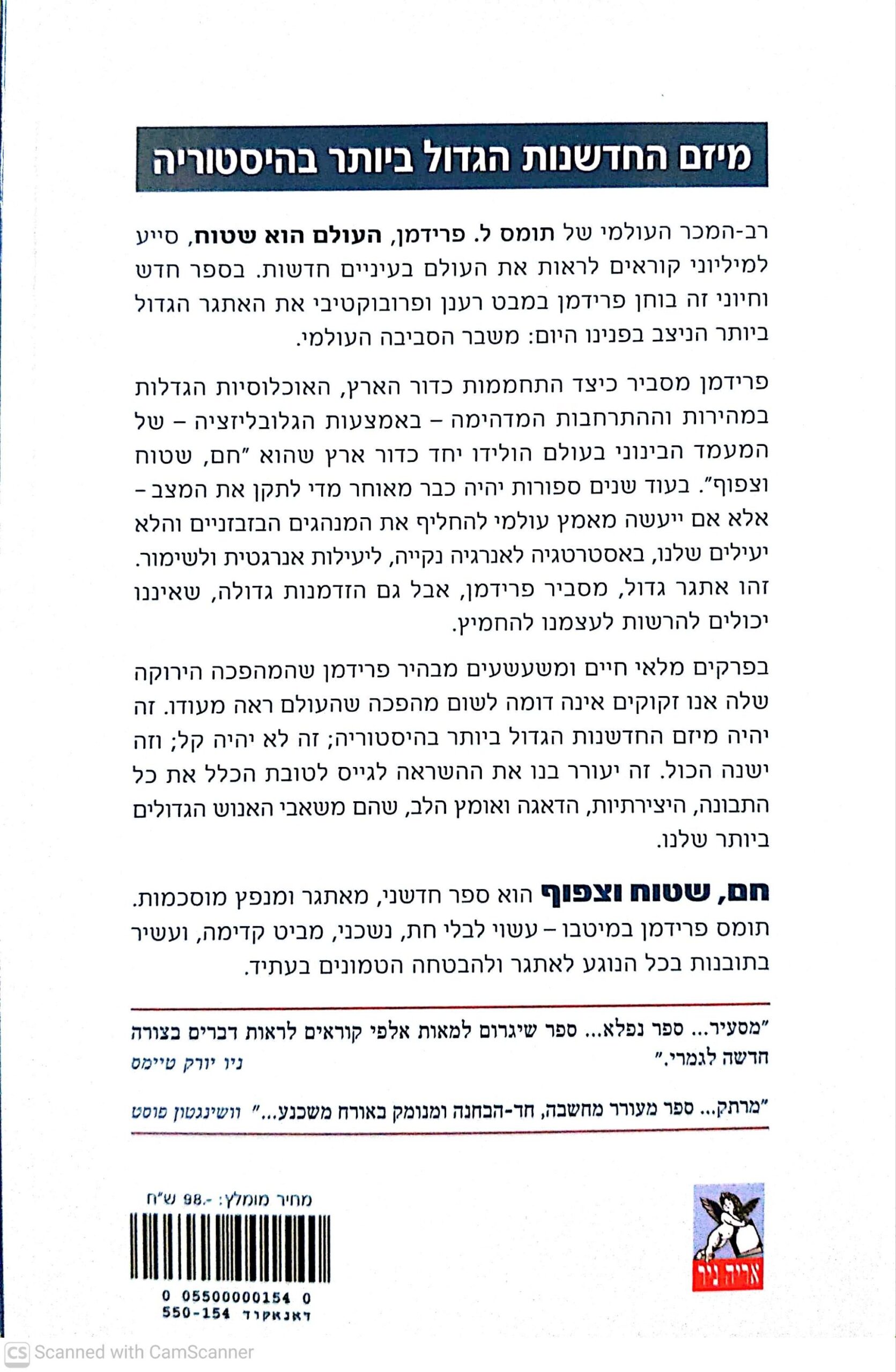 חם, שטוח וצפוף מאת תומס ל. פרידמן בוחן את התמורות שחוללו הגלובליזציה, הגידול באוכלוסייה וההאצה הטכנולוגית במערכת הכלכלית, החברתית והסביבתית של העולם המודרני. הספר מציג בצורה עניינית כיצד שלושת הכוחות הללו יוצרים מציאות חדשה של תחרותיות, עומס ומשאבים מתמעטים, ומעלה שאלות על עתיד האנושות, שוק העבודה והסביבה, תוך ניסיון להציע דרך להבין את האתגרים ולהתמודדות איתם בגישה מעשית.
