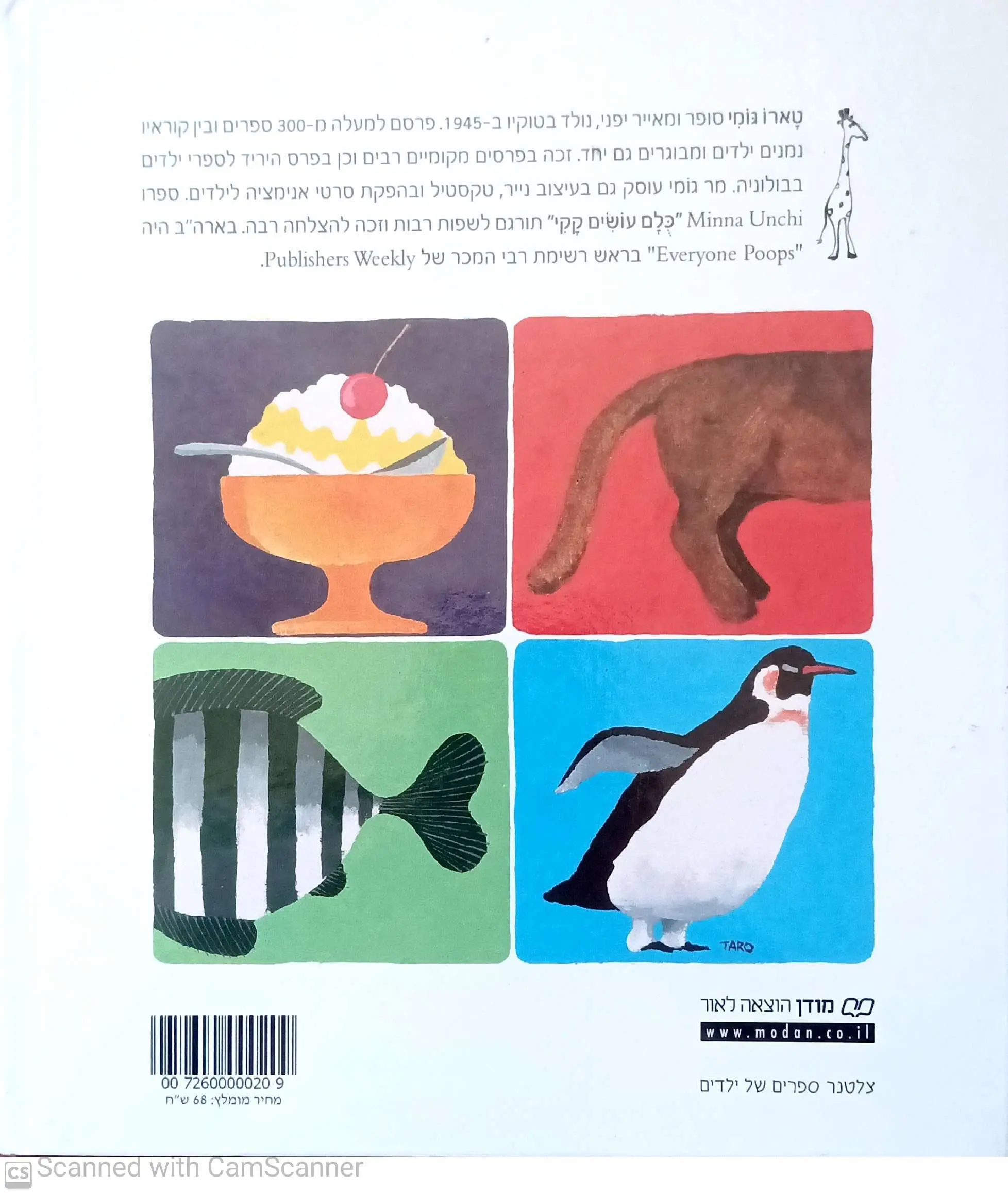 "כולם עושים קקי" מאת טארו גומי הוא ספר ילדים משעשע ומלמד, שמנפץ מבוכה ומעודד שיחה פתוחה על נושא יומיומי וטבעי לחלוטין — עשיית צרכים. הספר מציג שלל בעלי חיים, קטנים וגדולים, וממחיש כיצד כל אחד מהם עושה קקי בדרך שונה.