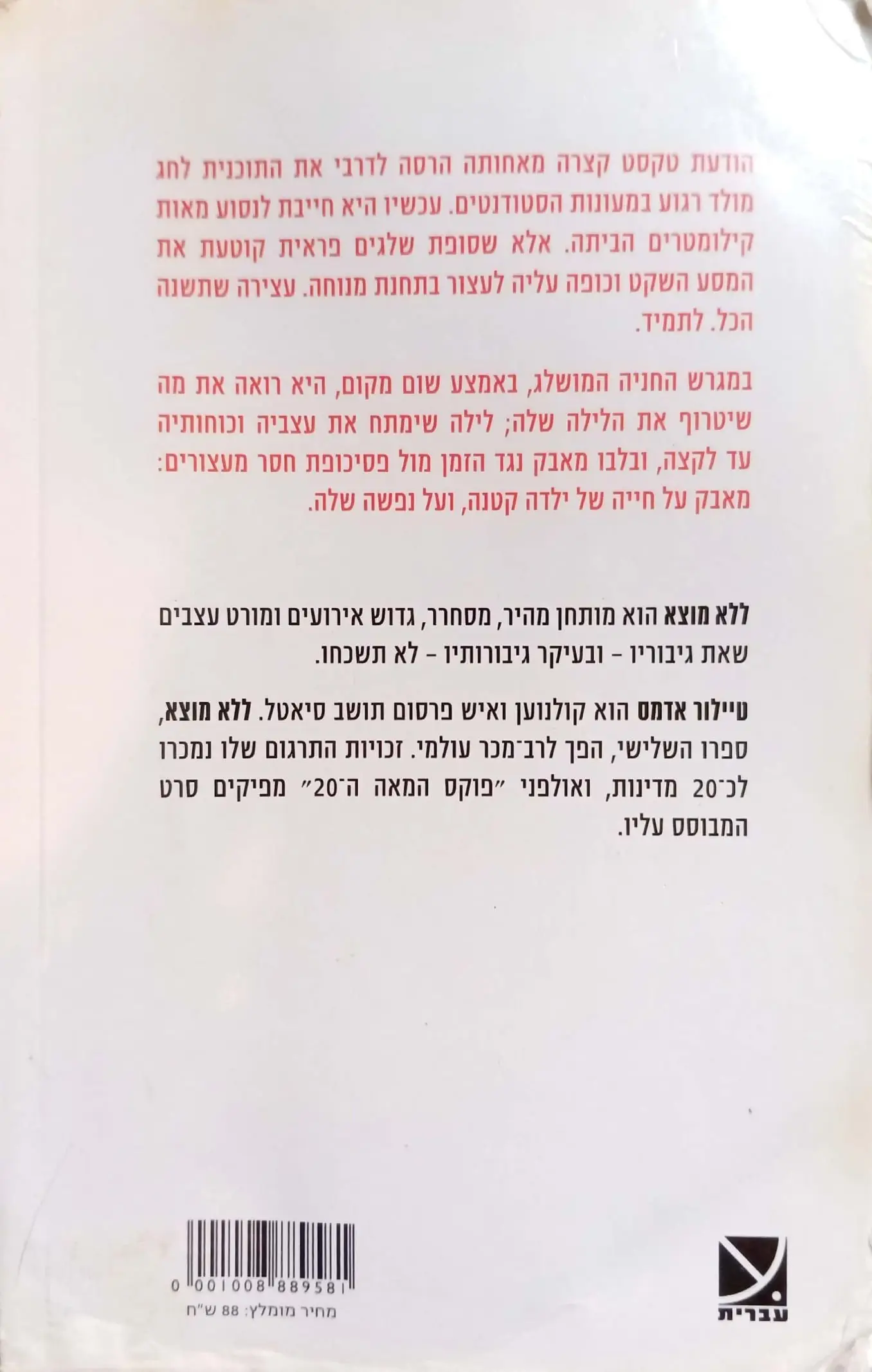 הספר "ללא מוצא" מאת טיילור אדמס הוא מותחן פסיכולוגי מרתק שפורסם בשנת 2017. העלילה עוקבת אחר דרבי ת'ורן, סטודנטית צעירה הנוסעת לבקר את אמה החולה. במהלך נסיעתה, היא נאלצת לעצור בתחנת מנוחה מבודדת בשל סופת שלגים עזה. במגרש החניה, היא מגלה ילדה כלואה בתוך רכב מסחרי, ומבינה שאחד מהאנשים בתחנה הוא חוטף מסוכן. דרבי מוצאת את עצמה במאבק נואש להצלת הילדה, תוך שהיא מתמודדת עם סכנות בלתי צפויות ועם השאלה במי מהנוכחים ניתן לבטוח.