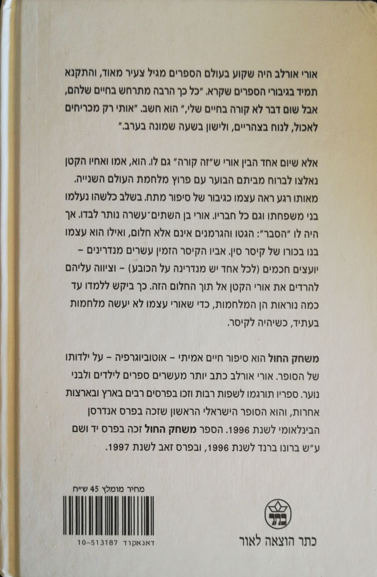 הספר "משחק החול" מאת אורי אורלב הוא סיפור ילדות מרגש המבוסס על חוויותיו האישיות של המחבר בתקופת השואה. בגוף ראשון ובשפה פשוטה אך חודרת לב, מתאר אורלב את עולמו של ילד המתמודד עם מציאות של פחד, אובדן ובדידות, אך גם מגלה בתוכו כוח דמיון ויכולת הישרדות יוצאת דופן. זהו ספר הנוגע בנושאים של ילדות, זיכרון ותמימות שנשמרת גם בלב הקושי, ונחשב לאחד מספרי הילדים החשובים שנכתבו על השואה.
