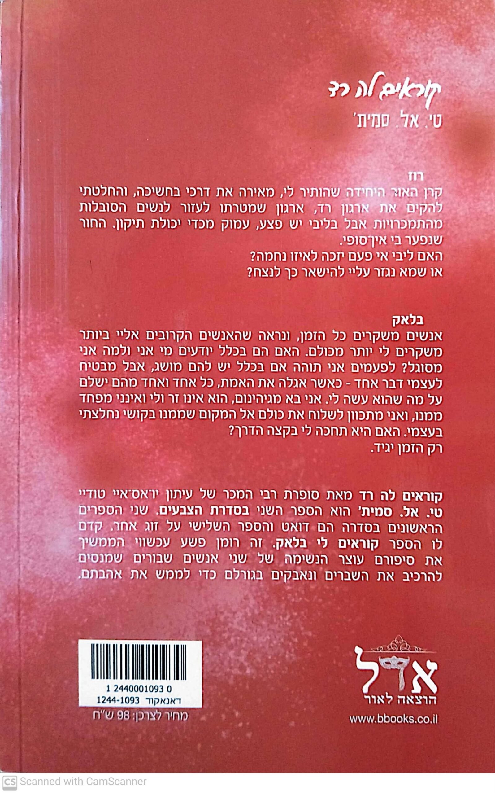 קוראים לה רד מאת טי. אל. סמית' הוא הספר השני בסדרת הצבעים, וממשיך את הסיפור עוצמתי והרגשי שהחל ב“קוראים לי בלאק”. במרכז העלילה עומד בלאק, גבר פגוע הנושא עימו עבר קשה וסודות שאינם מרפים. כדי להתמודד עם שברון לבו ועם רגשות האשמה, הוא מקים את “ארגון רד” – מקום שנועד לסייע לנשים הנאבקות בהתמכרויות. אך כשהוא פוגש את רוז, אישה אמיצה ומורכבת שמערערת את חומות ההגנה שבנה סביב עצמו, נפתח פתח לעולם חדש של אהבה, תיקון וכאב. זהו סיפור על תשוקה, ריפוי וניסיון למצוא אור בלב האפלה.