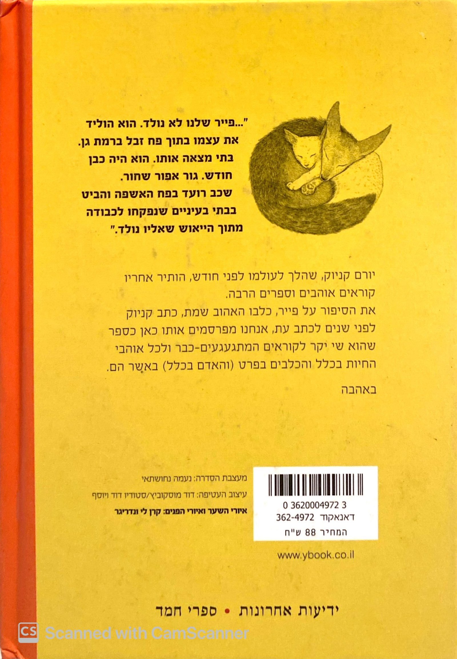 יורם קניוק מגולל בספר קצר ומרגש את סיפורו של פייר, כלבו האהוב, שאומץ על ידי בתו לאחר שנמצא כגור נטוש בפח אשפה. דרך תיאור הקשר המיוחד שנרקם ביניהם, קניוק מתבונן באהבה, באובדן ובחברות הנאמנה שבין אדם לכלבו. זהו טקסט אישי וכואב, הכתוב ברוך ובכנות, המשמר את זכרו של חבר קרוב.