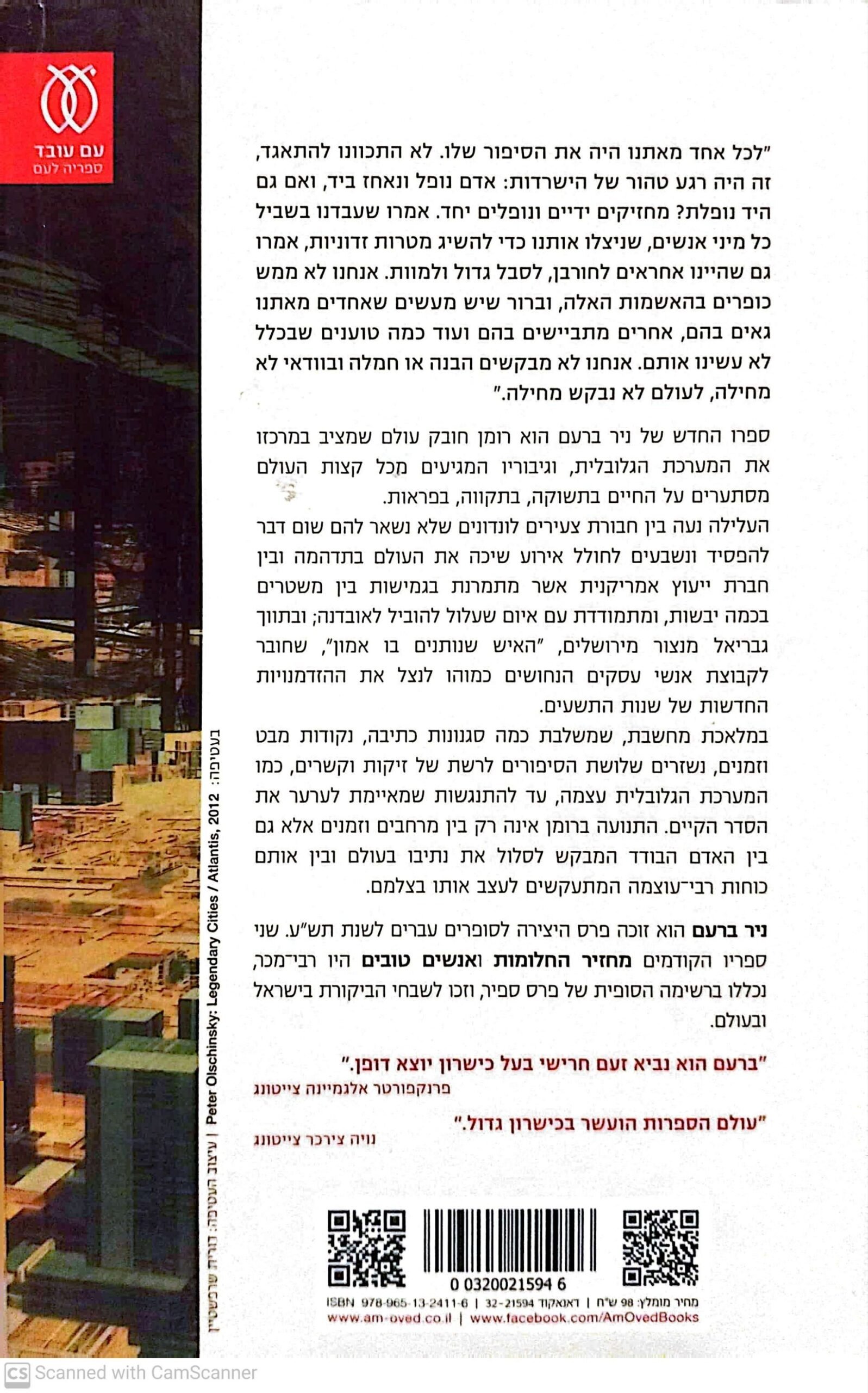 רומן רחב־יריעה הבוחן את עולמנו הגלובלי דרך שלוש נקודות מבט שונות: בירושלים, גבריאל מנצור מנסה לקדם את עצמו בעולם העסקים והפוליטיקה; באנגליה, קבוצת צעירים זועמים מתכננת מרד עולמי; ובארצות הברית, חברת ייעוץ פוליטי מפעילה מניפולציות מסוכנות בזירות שלטוניות. ניר ברעם שוזר את העלילות לרשת מורכבת של שאיפות, עימותים וסוגיות מוסריות במאה ה־21, ברומן עשיר ומעורר מחשבה על כוח, זהות, והעולם שאנו חיים בו.