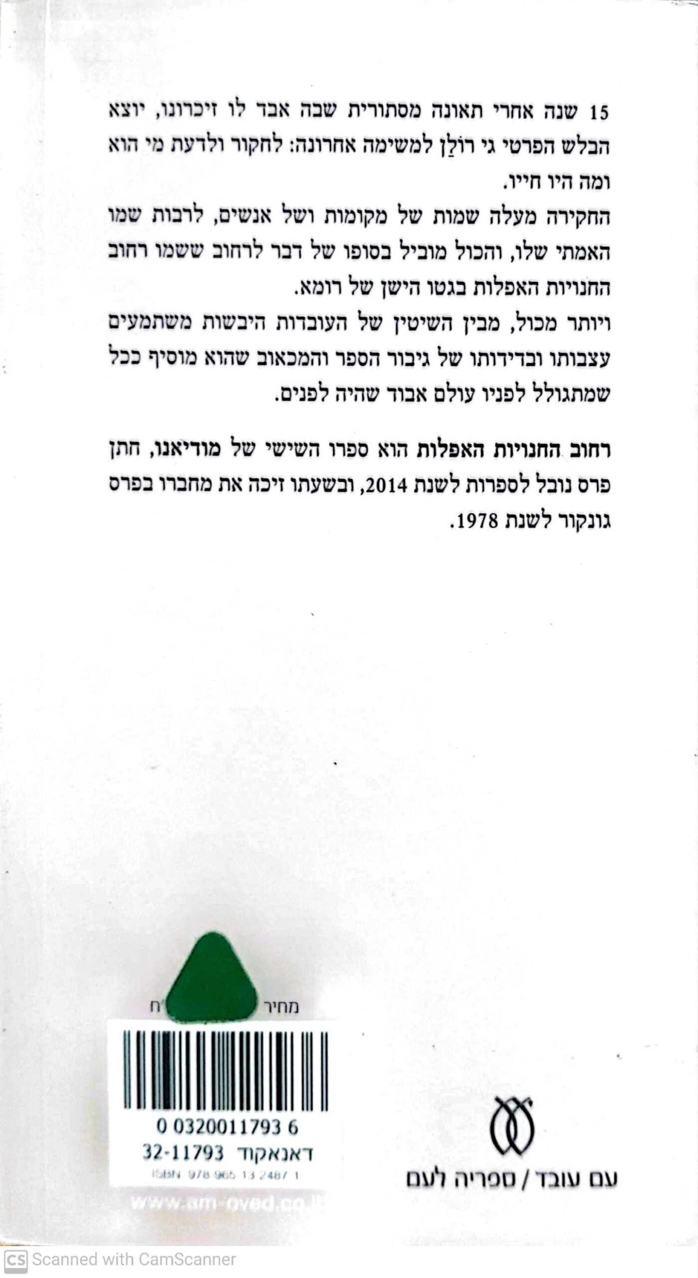 רחוב החנויות האפלות מאת פטריק מודיאנו הוא רומן חקירה עדין ומסתורי על זהות, זיכרון ואובדן. גי רולן, בלש פרטי שפרש מעבודתו, מגלה כי איבד את זיכרונו בתאונה שאירעה חמש־עשרה שנה קודם לכן. כשהעבר נמחק, הוא יוצא למסע של גילוי עצמי וניסיון נואש לשחזר מי היה, למי אהב, ואיזו אמת מסתתרת מאחורי חייו הנשכחים. בין סמטאות פריז ובין רמזים עמומים משנות המלחמה, נפרשת עלילה פיוטית ונוגעת ללב שבה הגבול בין מציאות לזיכרון מיטשטש. זהו אחד מספריו הידועים ביותר של מודיאנו, חתן פרס נובל לספרות, המשלב אווירה חידתית עם כתיבה מדויקת ורגישה.