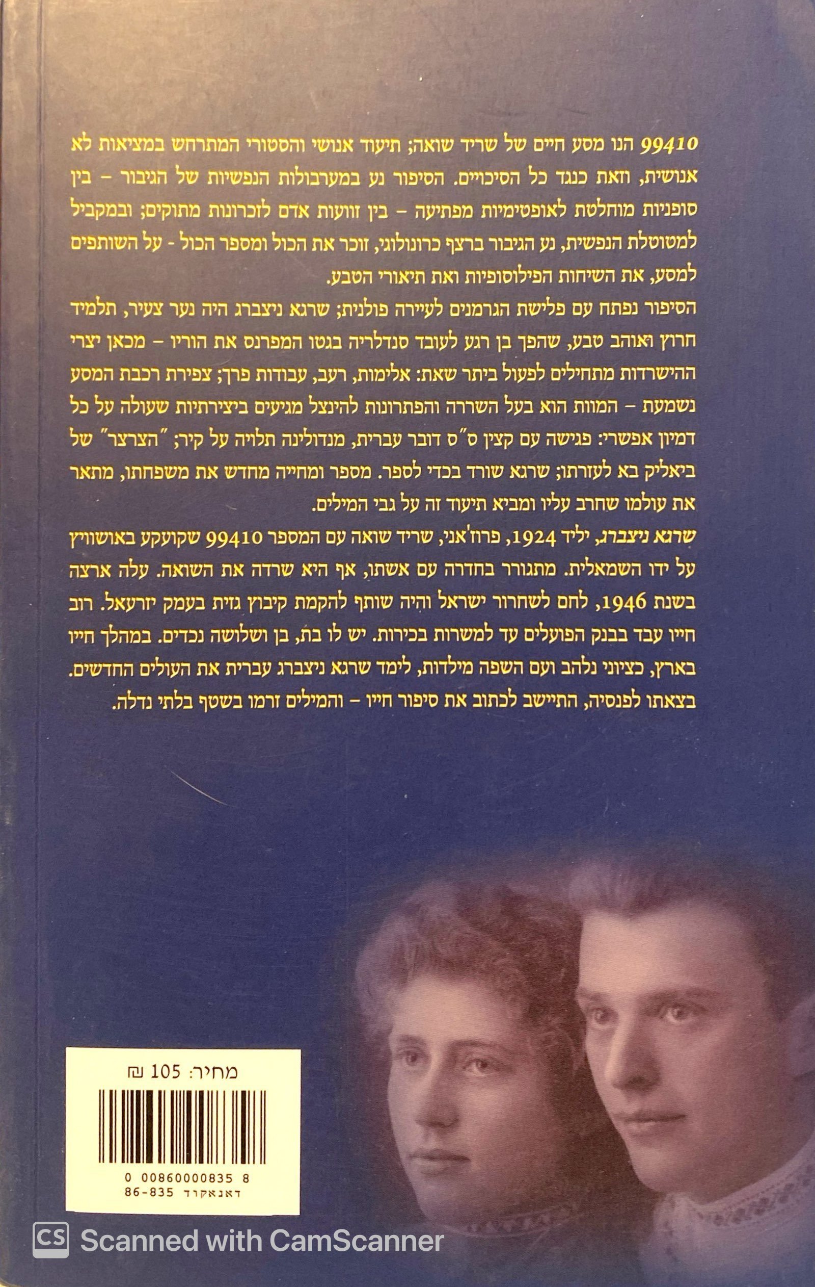 99410 מאת שרגא ניצברג הוא סיפור תיעודי אישי של ניצול שואה, המספר בגוף ראשון על חייו לפני השואה, במהלכה ואחריה. שם הספר לקוח ממספר האסיר שהוטבע על זרועו באושוויץ, ומשמש כסמל לזיכרון, זהות והישרדות. דרך כתיבה ישירה ולעיתים כואבת, נפרשים פרקי ילדותו בפולין, ההתמודדות בגטו ובמחנות, ועלייתו ארצה. זהו רומן ביוגרפי המציג שילוב של עדות היסטורית עם פרוזה אישית, ומציע הצצה נדירה לנפשו של אדם ששרד את התהום וכתב את סיפורו בשמו המלא ובקולו.